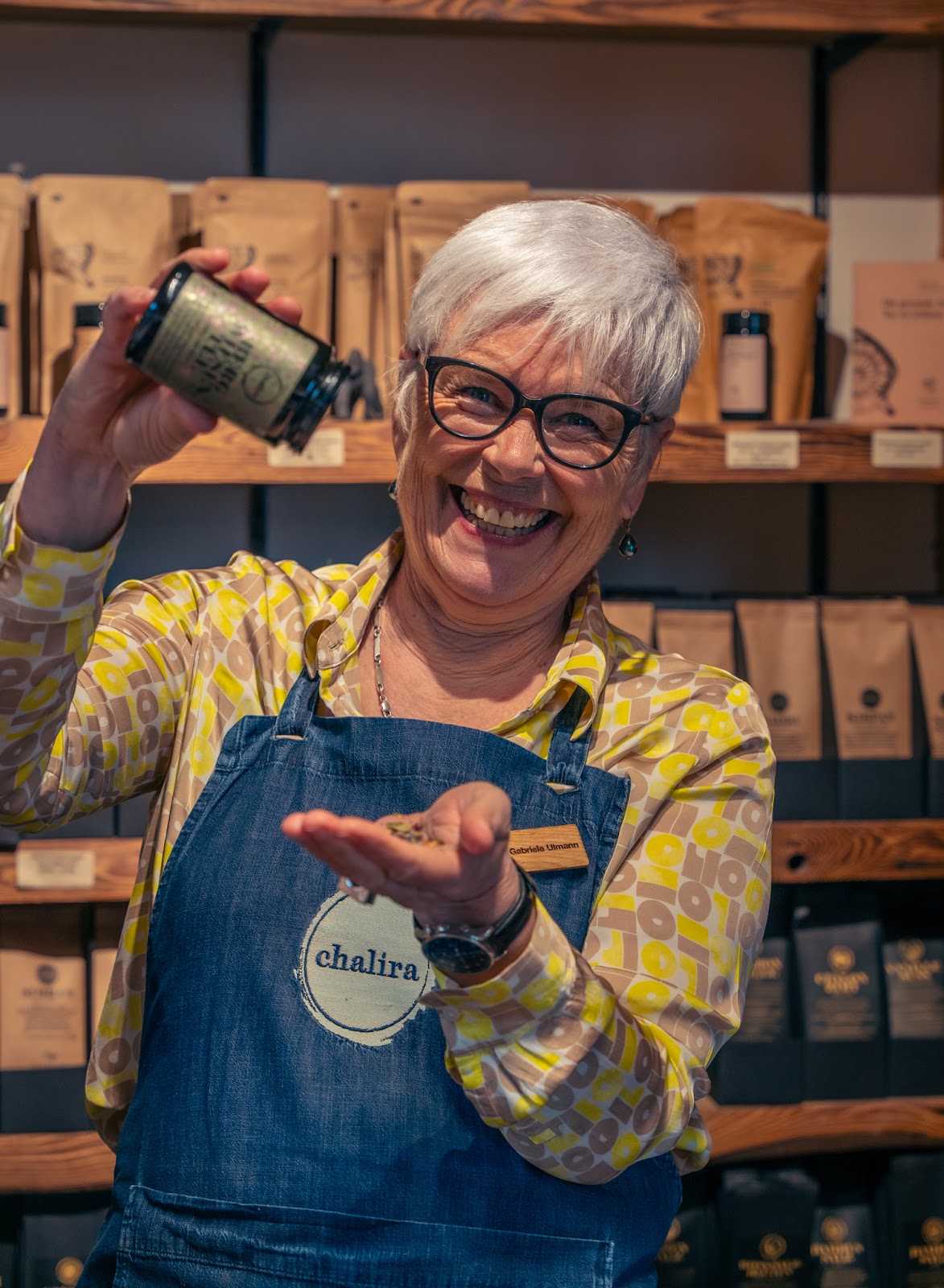 Gastgeberin und Ladenkraft bei Chalira, die mit Zuverlässigkeit, Menschenaffinität und Liebe zu Aromen Kundinnen, Events und seit 2024 auch Wiederverkäufer persönlich betreut.
