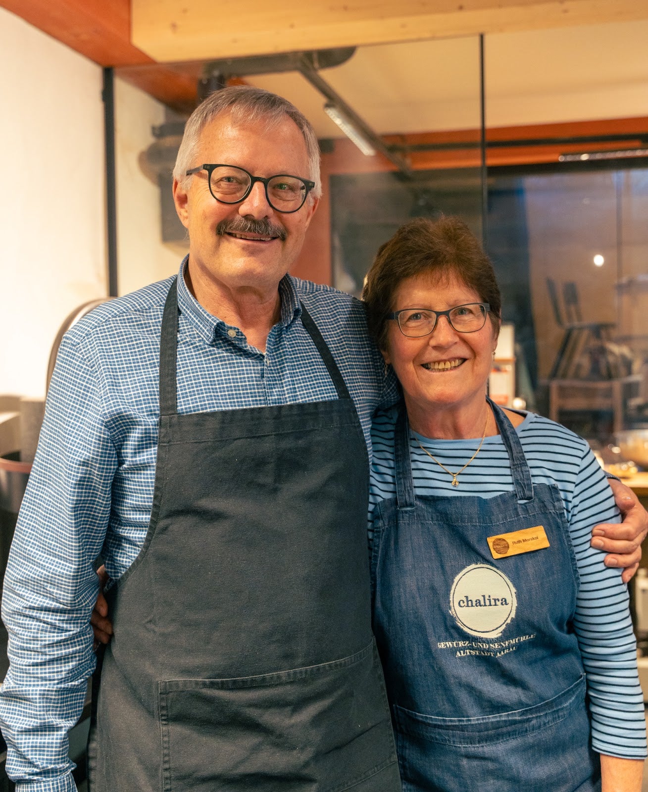 Das dynamische Familien-Duo bei Chalira: Ruth verzaubert im Laden und beim Geschenkset-Binden, Stephan unterstützt mit handwerklichem Geschick, Humor und Tatkraft beim Abfüllen und Etikettieren.
