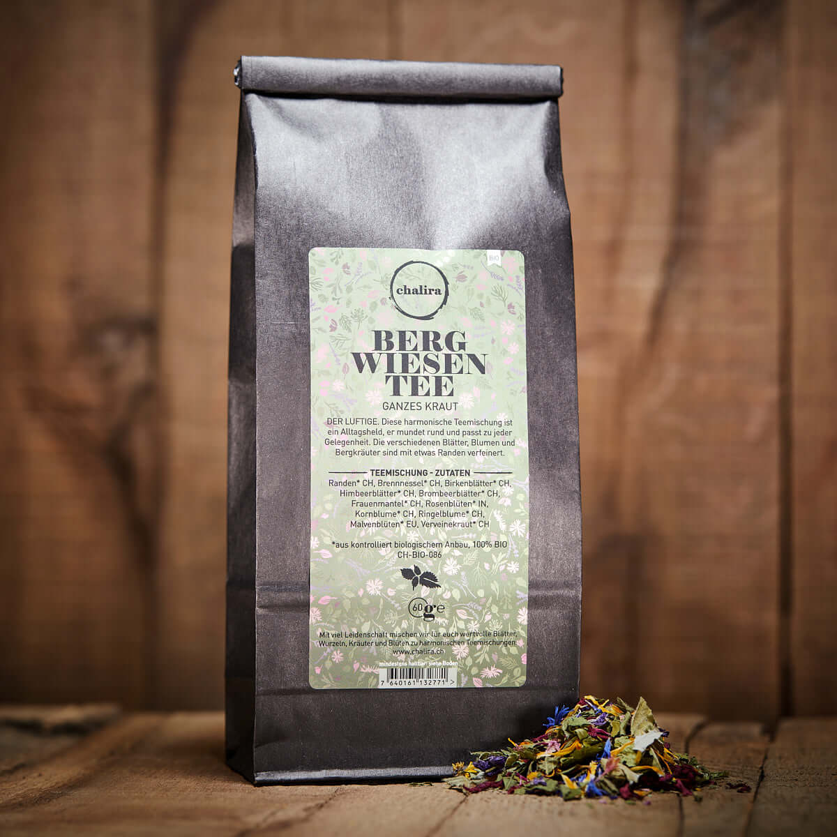Randen* CH, Brennnessel* CH, Birkenblätter* CH, Himbeerblätter* CH, Brombeerblätter* CH, Frauenmantel* CH, Rosenblüten* IN, Kornblume* CH, Ringelblume* CH, Malvenblüten* EU, Verveinekraut* CH *aus kontrolliert biologischem Anbau