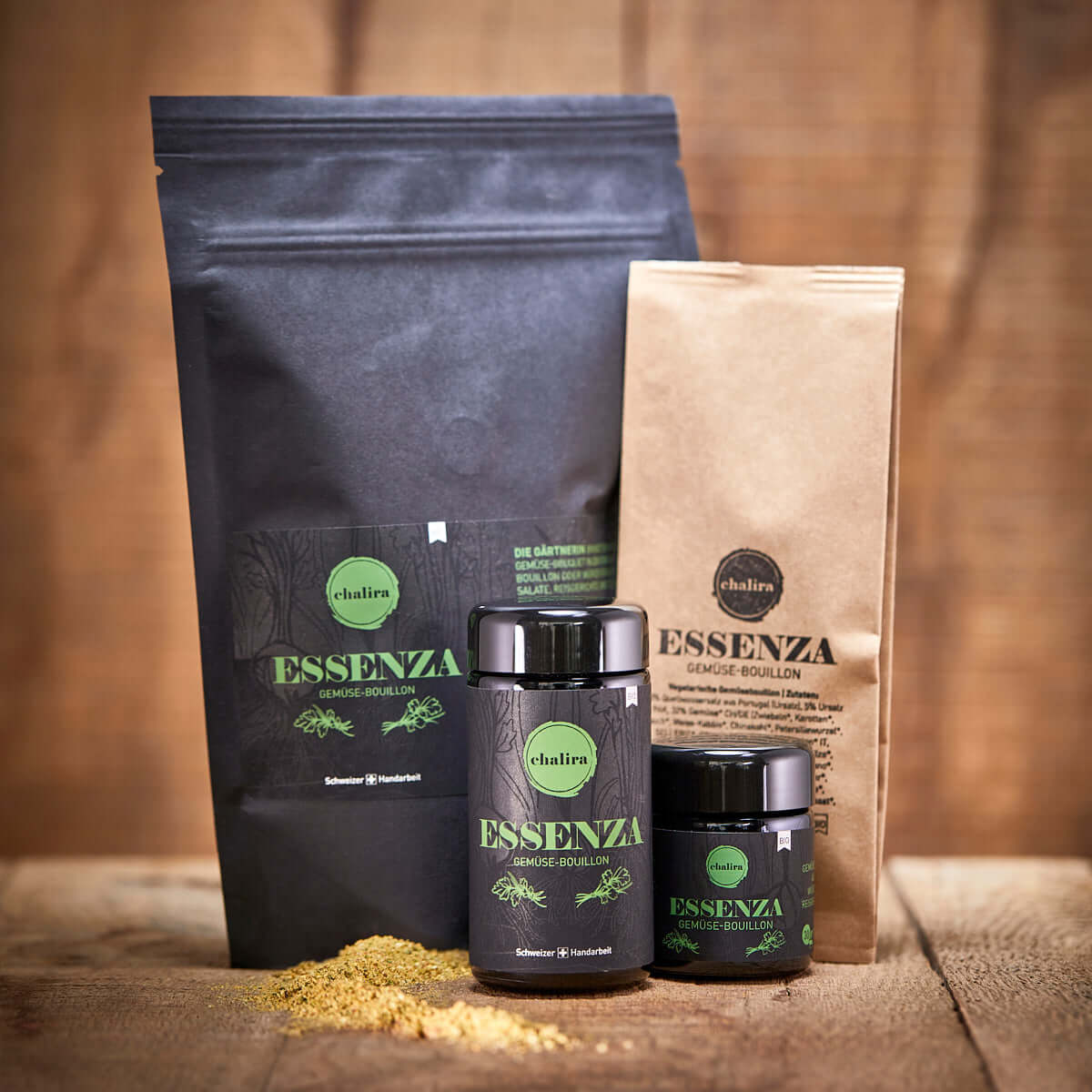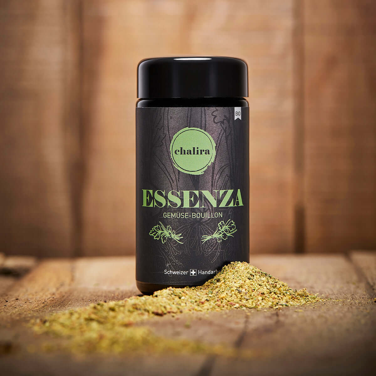 Zutaten: 60% Steinsalz, 35% Gemüse (Zwiebeln*, Karotten*, Lauch*, Weiss-Kabbis*, Chinakohl*, Petersilienwurzel*, SELLERIE*, STANGENSELLERIE*, Tomaten*, Knoblauch*), Dattelpulver*, Shiitake*, Steinpilze*, Kresse*, Bärlauch*, Liebstöckel*, Oregano*, kopfifiger Thymian *, Petersilie*, grüner Pfeffer*, weisser Pfeffer*, Spirulina Algen*, Nori Alge*, Kurkuma*, Asant*, Cayenne-Pfeffer*, Fenchelsaat*, Nelken*, Macis* "Die Entwicklung dauerte zwei Jahre. Es braucht aufwändige Prozesse, wie das Vakuumtrocknen des Senföles, Shiitake Pilz und Schnittlauch als Komponente der Bouillon. Das Gemüse stammt vom Brunner Eichhof in Spins im Seeland, das Gemüse und wird frisch mit dem Salz schonend dehydriert. Eine gute Streubouillon zu finden in Bioqualität mit regionalen Zutaten war kaum möglich, daher war es mir ein grosses Anliegen dieses Produkt zu kredenzen." Michael Morskoi
