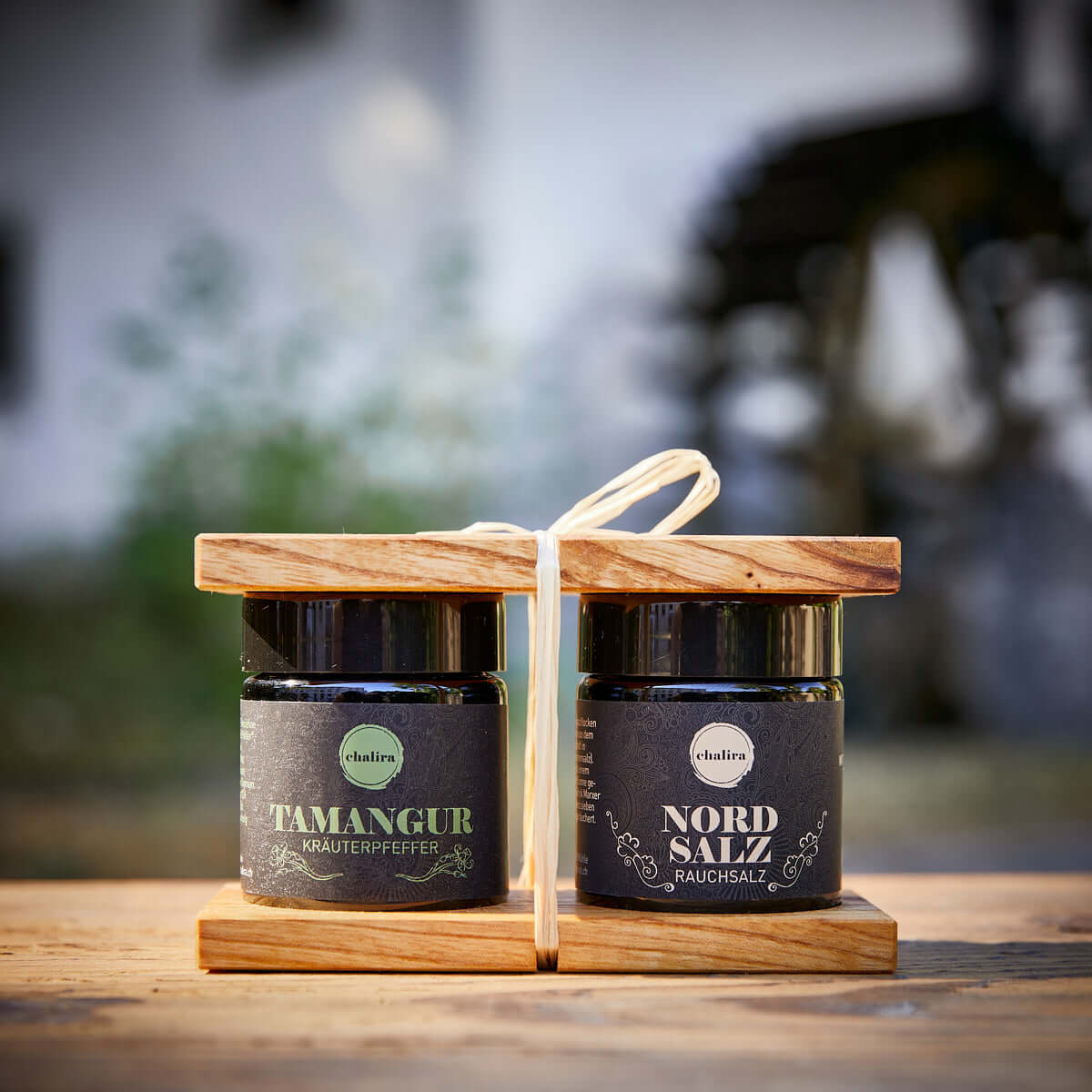 Der Kräuterpfeffer Tamangur (50ml), ein altes Rezept einer Mischung aus dem Puschlav mit dem Schweizer Rauchsalz Nordsalz (50ml) sind ein tolles Team.