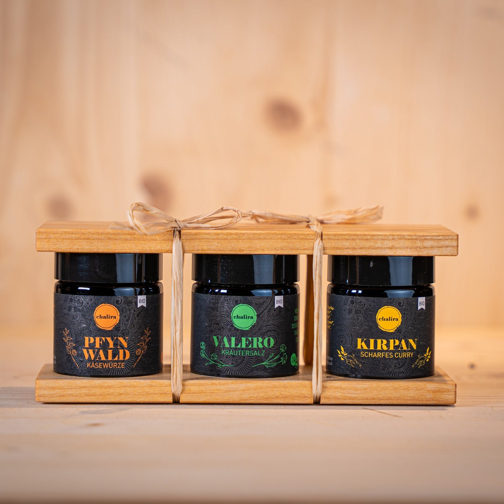 Trio Weltenbummler - Bio-Gewürzmischungen im Mironglas mit Holzset aus Schweizer Handarbeit.