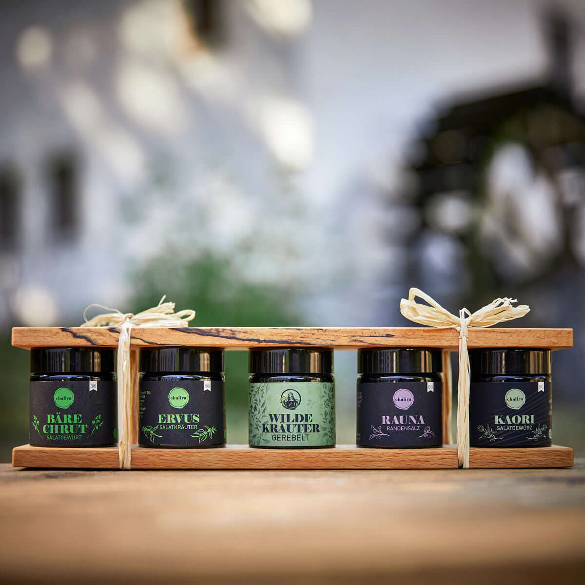 Bio-Gewürzmischungen im Mironglas mit Holzset aus Schweizer Handarbeit.