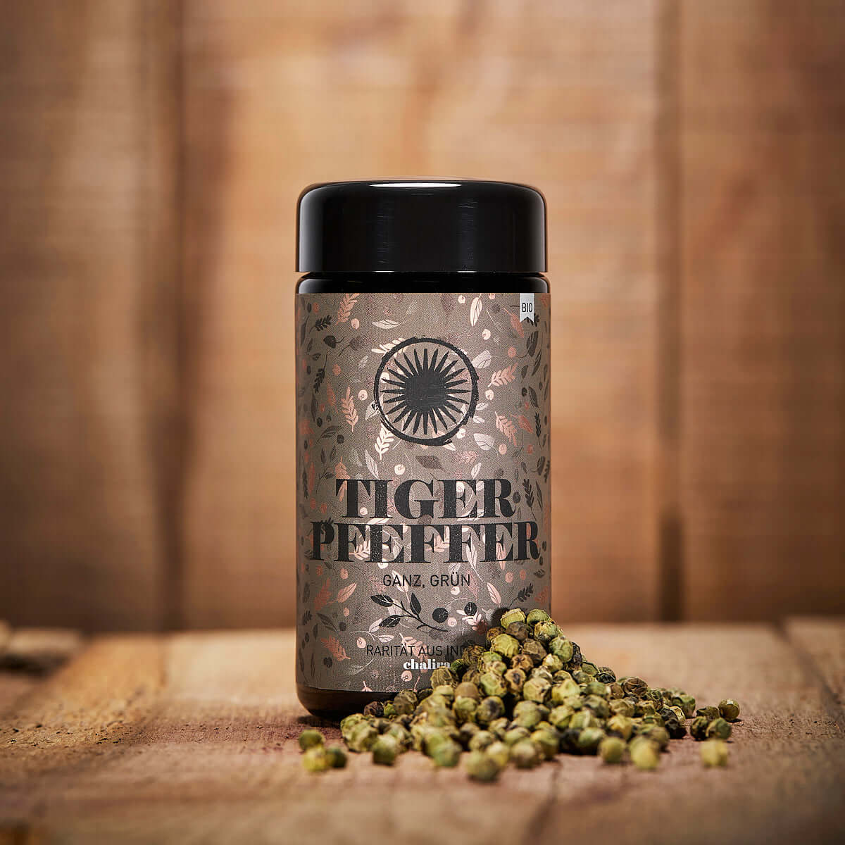 Der grüne Urwaldpfeffer wächst an der Malabarküste in Südindien am Rande des Tiger-Reservates. Durch die Mischkultur sind die Nuancen des Pfeffers vielseitig und ausgereift.